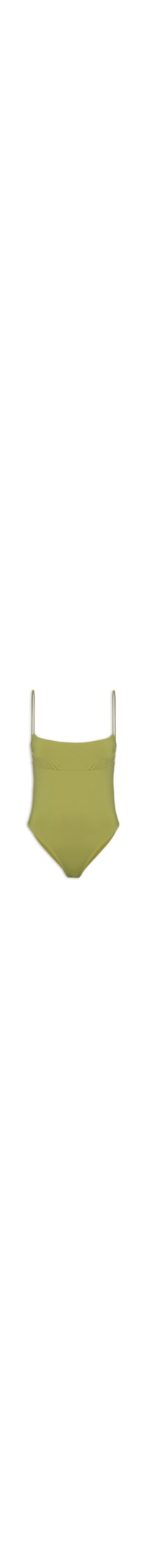 O maiô verde é confeccionado em malha leve de média elasticidade. A peça possui decote reto, alças finas com regulagem, recorte frontal, decote em U profundo com elástico embutido, cavas estendidas e forro.