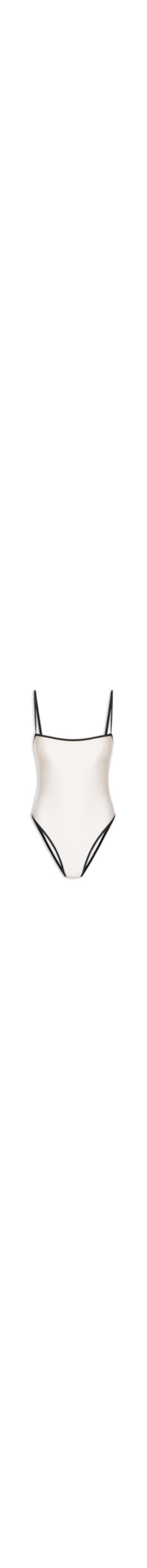 O maiô branco é confeccionado em malha de poliamida com alta elasticidade. A peça possui decote coração com detalhe de vivo em cor contrastante, alças finas reguláveis, bojo removível e acabamento elástico em cor contrastante.