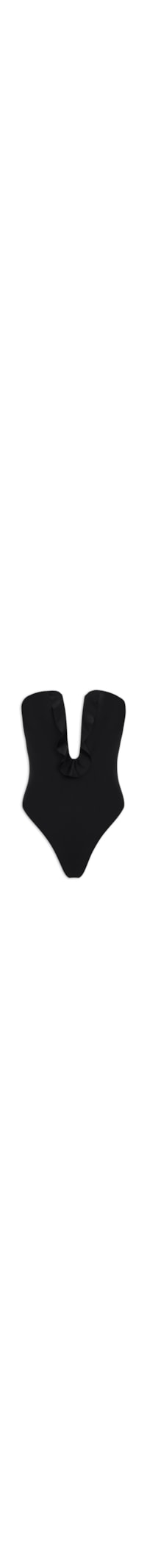 O maiô preto é confeccionado em malha de poliamida com alta elasticidade. A peça possui decote reto com recorte em V profundo com babado e bojo removível.