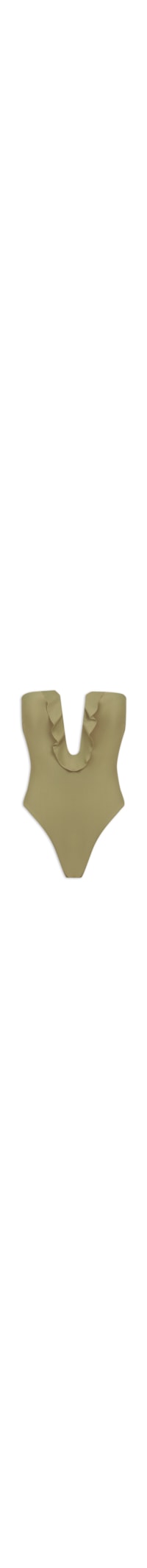 O maiô verde é confeccionado em malha cirrê com alta elasticidade. A peça de modelo tomara que caia possui decote reto com recorte vazado em U e babado aplicado, aviamento embutido para sustentação, detalhes laterais de franzidos, bojo e alças removíveis e forro.