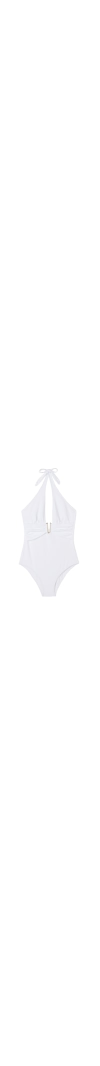 Selecione o tamanhoMaiô decotado com franzido abaixo do busto, sem aro e sem enchimento nas copas para um efeito natural. Possui um decote profundo e um acessório dourado no centro do busto. Completamente forrado e com costuras invisíveis. Parte de trás com corte estilo calcinha.