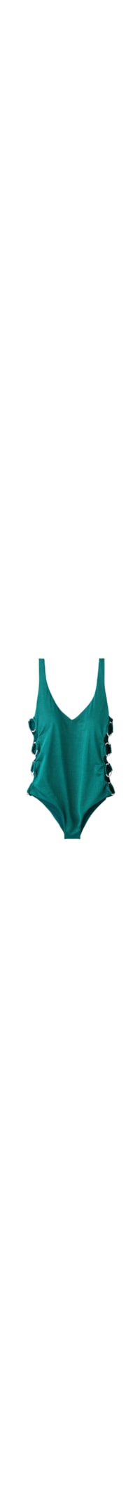Selecione o tamanhoMaiô em microfibra macia com copas triangulares levemente acolchoadas e sem aro. Decote frontal pronunciado definido por um elástico sob o busto. Tecido macio com fio lamê brilhante. O maiô apresenta uma fileira de argolas douradas sem níquel nas laterais. Totalmente forrado e com costuras invisíveis, projetadas para não deixar marcas. Parte traseira cavada com costura central para um ajuste melhor.