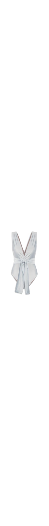 O maiô prata é confeccionado em malha cirrê com alta elasticidade. A peça possui decote V profundo com detalhe transpassado frontal e posterior, alças médias, cavas estendidas, forro, sem bojo, tira alongada removível para amarração e acabamento elástico.