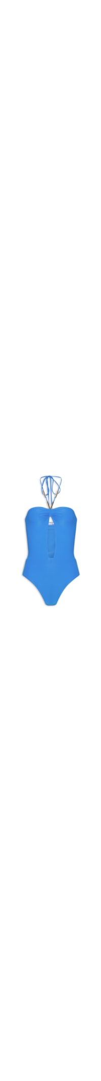 O maiô azul é confeccionado por malha de poliamida com média elasticidade. A peça justa ao corpo possui decote halter, recorte frontal vazado, tiras finas para amarração com detalhes de nós e canutilhos metalizados, forro e fechamento por amarração posterior.