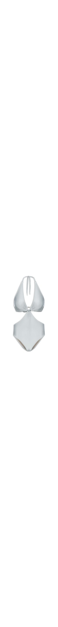 O maiô cinza é confeccionado em malha cirrê com alta elasticidade. A peça justa ao corpo de modelo frente única possui decote V, alças em tiras finas estendidas para amarração, cintura com recortes alterais e posterior vazados e argola metalizada embutida com detalhes de franzidos na parte frontal, forro e fechamento posterior por amarração.