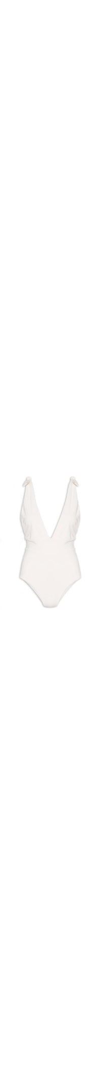 O maiô off white é confeccionado em malha de poliamida com média elasticidade. A peça justa ao corpo possui decote V profundo, alças médias com amarração superior, detalhe de faixas posteriores médias com efeito cruzado, tecido duplo e recortes frontais e posteriores.