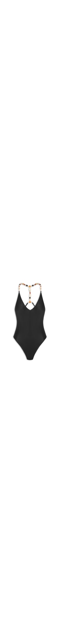 O maiô preto é confeccionado em malha de poliamida com alta elasticidade. A peça justa ao corpo possui decote em V, alças finas com aplicação de miçangas e decote nadador na parte posterior, cavas alongadas e forro.