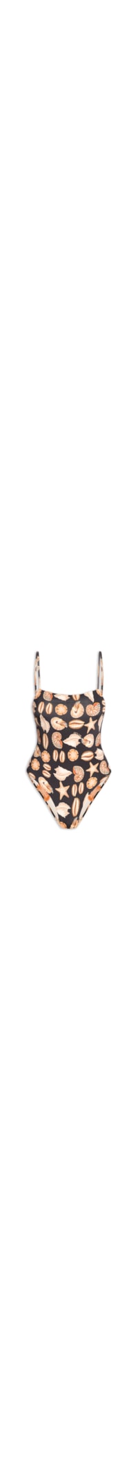 O maiô preto é confeccionado em malha de poliamida com média elasticidade. A peça de modelo dupla face possui decote arredondado, alças finas com regulagem, modelagem cavada, costas com decote amplo e tira posterior para amarração, aplicação de pingente metálico com formato figurativo de concha, padronagem figurativa em cores contrastantes, forro interno e fechamento posterior por amarração. A outra face possui cor bege com padronagem em cores contrastantes.