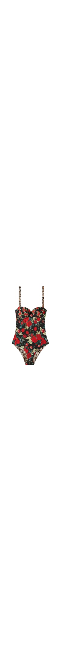 Selecione o tamanhoMaiô em tecido de dupla face com copas ligeiramente almofadadas e aro, perfeito para seios mais generosos. O modelo caracteriza-se por um elegante estampa de rosas vermelhas em um dos lados e por um estampado animal do outro, oferecendo uma dupla utilização. Fechamento com laço nas costas. Alças reguláveis e removíveis. Corte estilo calcinha na parte inferior.