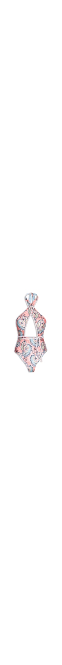 O maiô azul é confeccionado em malha de poliamida com alta elasticidade. A peça modelo dupla face possui decote trapézio, efeito transpassado na parte frontal, alças médias para amarração posterior, estampa paisley em cores contrastantes, recorte vazado na parte frontal, acabamentos em cordão com efeito trançado na cor rosa e azul, forro e bojo removível. A outra face é apenas na cor azul.