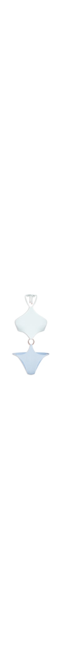 O maiô azul é confeccionado em malha de poliamida com superfície texturizada e alta elasticidade. A peça de modelo engana mamãe possui decote halter, argola metalizada embutida na parte frontal, laterais finas com regulagem na altura do quadril, bojo removível, parte superior na cor verde, bojo removível, forro, e fechamento posterior por amarração por cordões com pedrarias aplicadas.