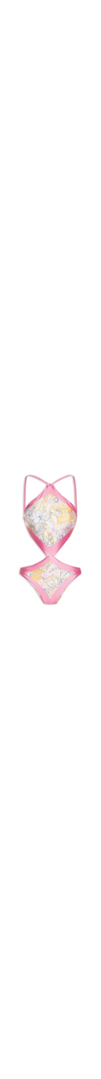 O maiô rosa é confeccionado por malha de poliamida com média elasticidade. A peça justa ao corpo de modelo engana mamãe possui decote halter, alças finas estendidas para amarração, bojo removível, recorte frontal na altura da cintura, alças laterais médias, forro, mix de estampas em cores contrastantes e fechamento por amarração posterior.