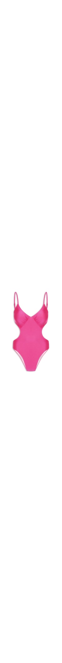 O maiô rosa é confeccionado malha de poliamida com média elasticidade. A peça possui decote V com detalhe franzido, detalhe vazado nas laterais, decote posterior, alças finas com regulagem, forro e bojo removível.