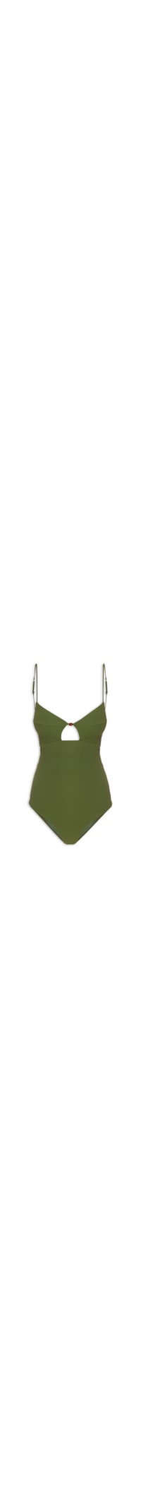 O maiô verde é confeccionado em malha de poliamida canelada. A peça possui decote U, alças finas reguláveis, recorte posterior vazado, bojo, recorte na altura do busto, recorte frontal vazado, forro, aplicação frontal de esférica em acrílico com cor contrastante, shape justo e fechamento posterior por colchete.