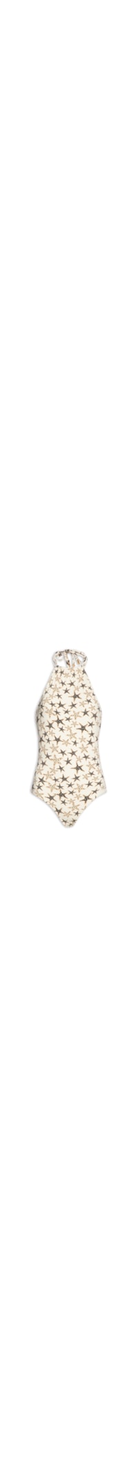 O maiô bege é confeccionado em malha justa com alta elasticidade. A peça de modelo frente única possui decote trapézio, alças finas reguláveis por amarração posterior, forro e estampas figurativas de estrelas nas cores preto e rosa.