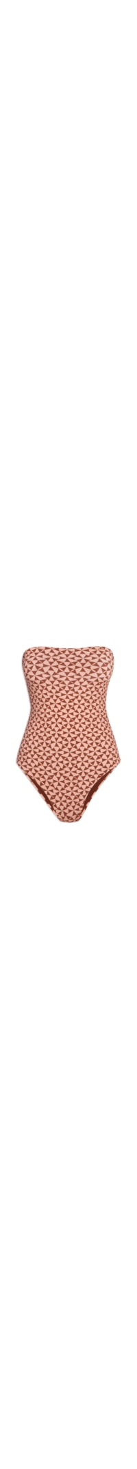 O maiô rosa é confeccionada em malha de poliamida com alta elasticidade. A peça justa ao corpo de modelo tomara que caia possui decote reto, forro e padronagem geométrica em cor contrastante.