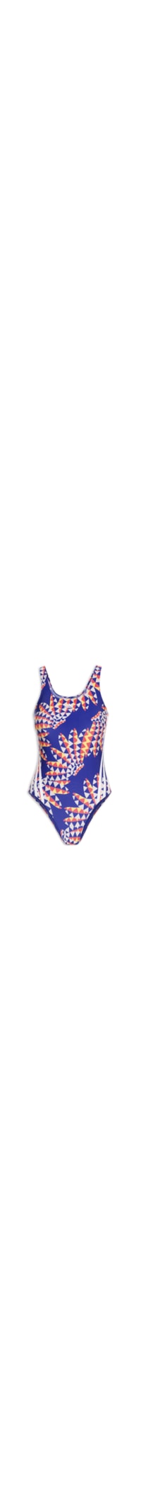 O maiô azul é confeccionado em malha cirrê com média elasticidade. A peça possui decote U, alças médias, cavas estendidas, nome e logo emborrachados da marca aplicados na parte frontal em tom contrastante, listras laterais aplicadas em viés de tom contrastante, recorte posterior vazado, estampa geométrica em tons contrastantes, forro, sem bojo e acabamento elástico.