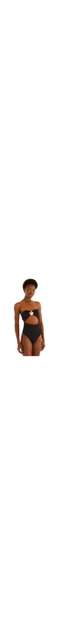 O maiô preto é confeccionado em malha de poliamida com baixa elasticidade. A peça justa ao corpo possui decote tomara que caia, aplicação central em formato floral em material rígido contrastante, recorte frontal vazado abaixo do busto, caimento ajustado, cava média, decote posterior reto, acabamento pespontado e modelagem anatômica. Possui forro e não apresenta fechamento.