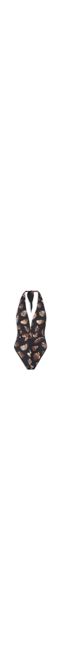 O maiô preto é confeccionado por malha de poliamida com média elasticidade. A peça justa ao corpo de modelo frente única possui decote V profundo, alças médias, cavas estendidas, bojo embutido e estampa figurativa de ostra.