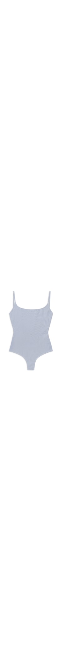 O maiô azul é confeccionado em malha com superfície texturizada e alta elasticidade. A peça possui decote frontal U e posterior U profundo, alças finas, sem bojo, padronagem listrada na cor off white e forro.