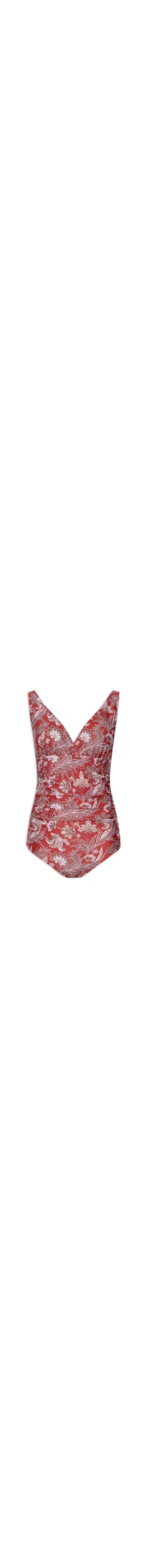O maiô vermelho é confeccionado em malha de poliamida com alta elasticidade. A peça justa ao corpo possui decote em V, alças médias, detalhe franzido com efeito drapeado nas laterais decote posterior em U e estampa paisley em cores contrastantes.