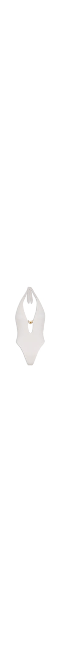 O maiô branco é confeccionado em malha leve com superfície texturizada de média elasticidade. A peça de modelo frente única, possui Decote em V profundo com detalhe de aplicação metálica na parte frontal, alças médias estendidas para amarração posterior, alça fina removível na parte posterior, tag metálica da marca aplicada na parte posterior da cintura, forro e bojo removível.