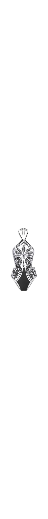 O maiô preto é confeccionado em malha de poliamida com alta elasticidade. A peça justa ao corpo possui decote halter, alças finas com amarração no pescoço, mix de estampa na cor branca, forro, recortes laterais vazados e fechamento posterior por amarração.