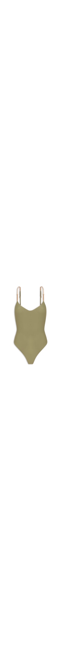 O maiô verde é confeccionado em malha cirrê com alta elasticidade. A peça possui decote V, alças finas reguláveis com recorte em cordão elástico e aplicação de miçangas de resina, decote posterior em U profundo, bojo removível e forro.