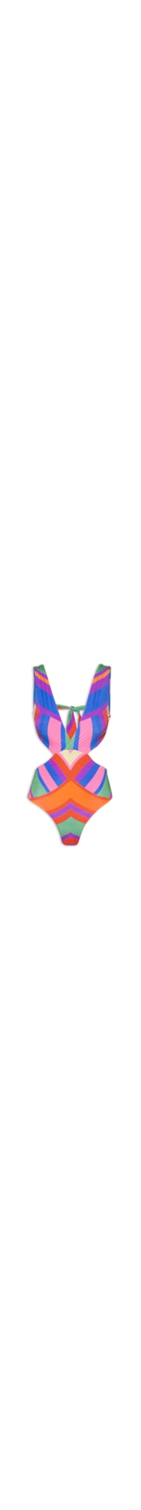 O maiô azul é confeccionado em malha de poliamida com média elasticidade. A peça possui decote frontal V profundo transpassado e posterior quadrado, alças médias, sem bojo, recorte vazado na altura da cintura, forro, estampa listrada em cores contrastantes e fechamento posterior por amarração.