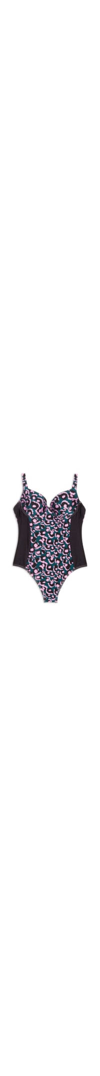 O maiô animal print é confeccionado em malha de poliamida. A peça possui decote meia taça, bojo com enchimento, alças finas reguláveis, recortes laterais, forro e acabamento pespontado.