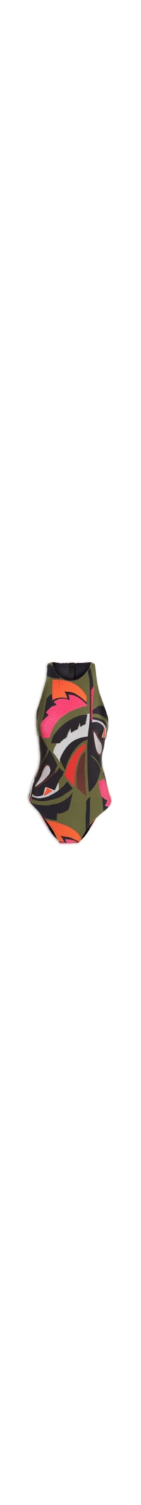O maiô preto é confeccionado em malha de poliamida. A peça justa ao corpo possui decote frontal trapézio e posterior nadador, cavas estendidas, pences frontais na altura do busto, estampa figurativa de folhagem em cores contrastantes, forro, acabamento elástico e fechamento posterior por zíper com vista sobreposta na altura do decote.