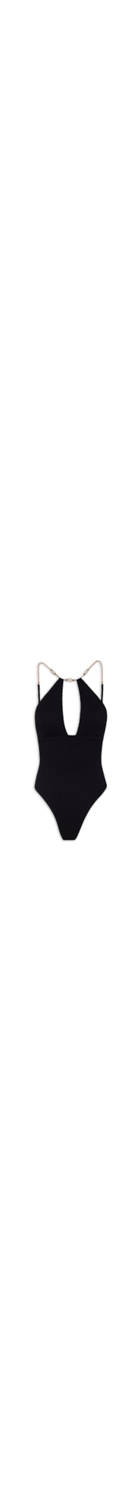 O maiô preto é confeccionado em malha creponada com alta elasticidade. A peça possui decote trapézio, alças finas com aviamentos aplicados na parte frontal e alças reguláveis na parte posterior e recorte frontal na altura do busto.