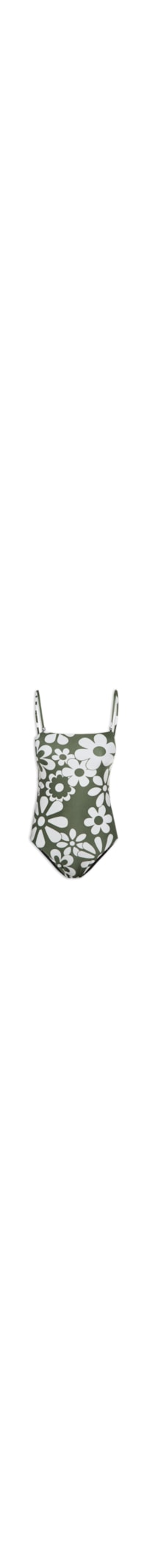O maiô verde é confeccionado em malha de poliamida. A peça possui decote frontal e posterior reto, alças finas reguláveis e removíveis, cavas regulares, forro e estampa floral em cor contrastante.