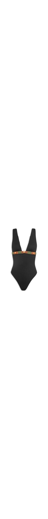 O maiô preto é confeccionado em malha creponada. A peça possui decote frontal V profundo e posterior quadrado, alças médias com regulagem, cavas estendidas, bojo, recorte na altura do busto com detalhes metálicos e padronagem de chevron em bordado com fios de cores contrastantes.