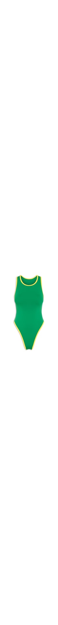 O maiô verde é confeccionado em malha de poliamida. A peça de modelo asa delta possui decote frontal redondo, alças médias, cavas estendidas, decote posterior nadador, recorte posterior vazado, forro, cavas e recorte com acabamento em viés na cor amarela, shape justo, caimento reto e acabamento elástico.