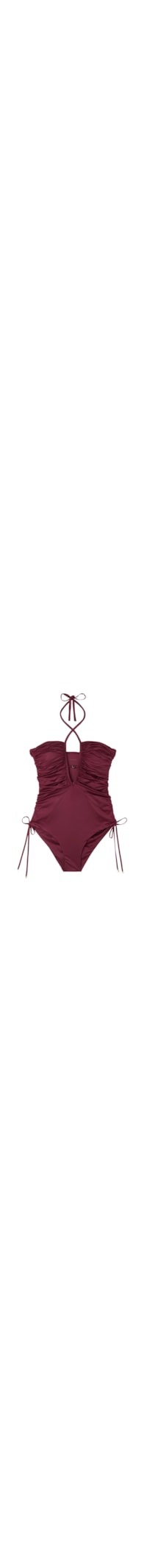 Maiô com copas ligeiramente almofadadas e decote pronunciado, adornado por um elegante acessório dourado. Apresenta um drapeado regulável com cordões laterais, permitindo modificar o corte cavado. O tecido brilhante com efeito de seda é muito macio e confortável. Pode ser usado com um laço no centro do seio ou amarrado atrás do pescoço, com ou sem cruzamento no decote. O corte na parte inferior é estilo calcinha, ligeiramente cavado. Completamente forrado.