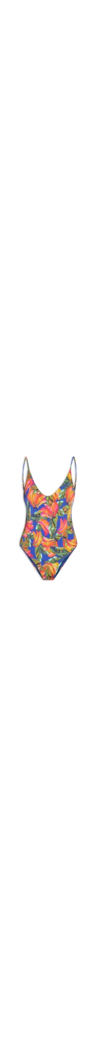 O maiô azul é confeccionado em malha com alta elasticidade. A peça justa ao corpo possui decote V, alças finas reguláveis, cavas estendidas, recorte posterior vazado, forro e mix de estampa figurativa em tons contrastantes.