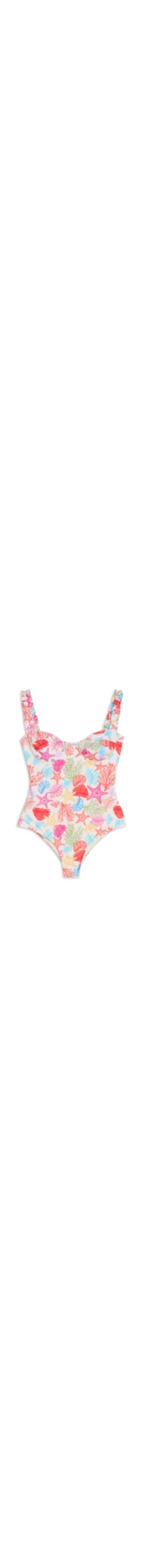 O maiô rosa é confeccionado em malha com alta elasticidade. A peça possui decote frontal meia taça e posterior U profundo, alças médias com acabamento ripple, recortes na altura do busto e mix de estampas em cores contrastantes.