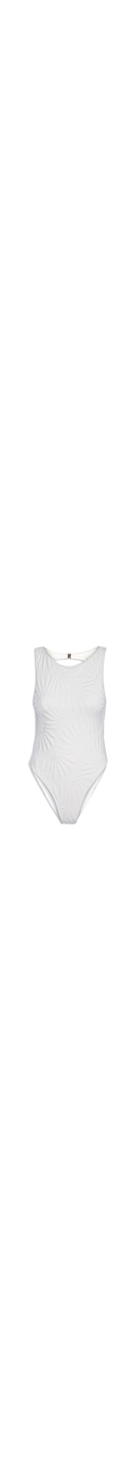 O maiô off white é confeccionado em malha de poliamida com superfície texturizada e média elasticidade. A peça possui decote redondo, alças médias, cavas estendidas, recorte posterior vazado, detalhes em relevo figurativo de bananas, forro, sem bojo, acabamento elástico e fechamento posterior de encaixe metálico.