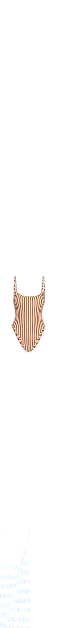 O maiô vermelho é confeccionado em malha de poliamida com média elasticidade. A peça possui decote frontal arredondado e posterior em U, alças finas reguláveis, pences frontais e estampa de listras em cores contrastantes.