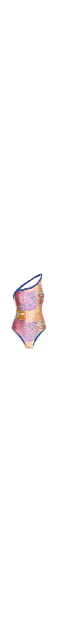 O maiô rosa é confeccionado em malha com média elasticidade. A peça de modelo ombro único possui decote assimétrico, alça média, decote e alça trançados na cor azul, bojo removível, forro e mix de estampas em cores contrastantes.