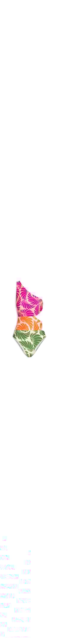 O maiô rosa é confeccionado em malha de poliamida com alta elasticidade. A peça justa ao corpo possui decote ombro único, alça média, cava regular, recortes laterais vazados com detalhes com efeito torcido, recortes nas partes frontal e posterior, forro e estampa figurativa em cores contrastantes.