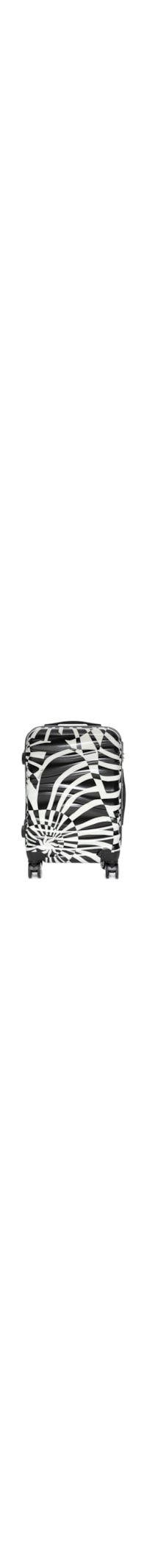 A mala preta é produzida em plástico abs com estrutura rígida e superfície texturizada. A peça possui tamanho médio, formato retangular, compartimento interno amplo com forro em tactel e divisória de fechamento em zíper, faixas de gorgurão com fecho por engate na parte interna, estampa abstrata em cores contrastantes, apoiadores emborrachados aplicados na lateral, cadeado integrado na lateral, 4 rodas multidirecionais, alça fixa de mão na parte superior e lateral, puxador metálico retrátil na parte superior e fechamento frontal por zíper.