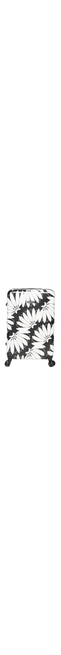 A mala preta é produzida em plástico ABS. A peça de tamanho grande, possui formato retangular, quatro rodinhas giratórias multidirecionais, alça retrátil superior ajustável, alça fixa lateral e superior, tag da marca emborrachada aplicada na parte frontal, compartimento principal amplo, forro em tecido preto, cintas elásticas cruzadas com nome da marca em relevo, 2 bolsos internos amplos com fechamento por zíper, sendo 1 bolso em mesh com transparência, recorte frontal com nome da marca na cor branca, estampa floral em cores contrastantes, 4 apoios laterais em plástico, e fechamento em zíper com trava TSA acoplada.