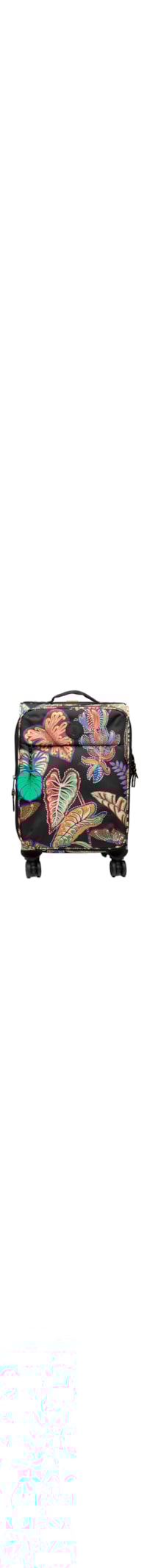 A mala preta é produzida em lona. A peça possui tamanho pequeno, formato retangular, estrutura rígida, compartimento interno amplo com forro em tactel, faixas de gorgurão com fecho por encaixe, 2 bolsos internos amplos com fechamento por zíper, sendo 1 bolso em material sintético branco com transparência, extensor na parte frontal com fechamento por zíper, bolso frontal embutido com fechamento por zíper com puxador em cordão com detalhe figurativo em borracha com cores contrastantes com etiqueta de identificação na parte posterior, faixa de gorgurão na parte superior, alças de mão em gorgurão nas partes lateral e superior, faixa e alças com detalhe do nome da marca em baixo-relevo, tag da marca aplicada em borracha na parte frontal, puxador metálico retrátil em cor contrastante na parte superior, detalhe de bases para apoio em material sintético na parte lateral, estampa de folhagem em cores contrastantes, cadeado integrado na parte lateral, 4 rodas multidirecionais e fechamento frontal por zíper com puxador.