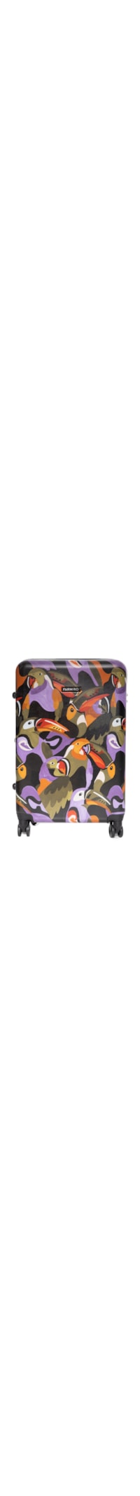 A mala roxa é produzida em material sintético. A peça possui tamanho grande, formato retangular, tamanho grande, compartimento interno amplo com forro, bolso amplo em tela com fechamento por zíper, faixas de gorgurão com o nome da marca e fechamento por fecho engate, extensor com fechamento por zíper, alça metálica retrátil, alça de mão nas partes superior e lateral, tag da marca aplicada em borracha na parte frontal, estampa de tucanos em cores contrastantes, aplicações laterais para apoio na cor preto, cadeado embutido na parte lateral, rodas multidirecionais e fechamento por zíper.
