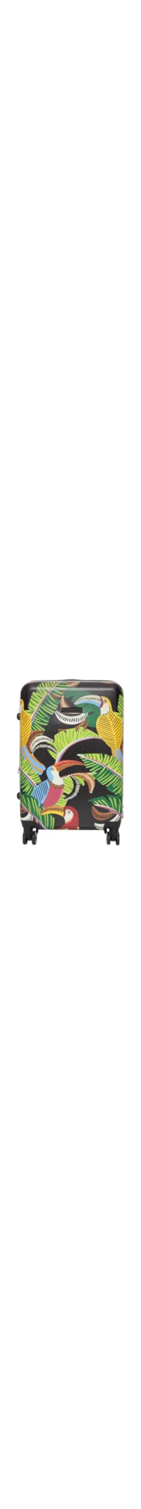 A mala preta é produzida em material rígido com superfície lisa e acabamento estampado. A peça de modelo estruturado possui tamanho médio, formato retangular, estampa tropical de folhagem com tucanos em cores contrastantes, compartimento interno amplo com divisórias e forro, alça de mão superior e lateral, alça retrátil com ajuste de altura, quatro rodas com giro 360°, detalhe de logo aplicado na parte frontal, cadeado com segredo acoplado e fechamento por zíper.