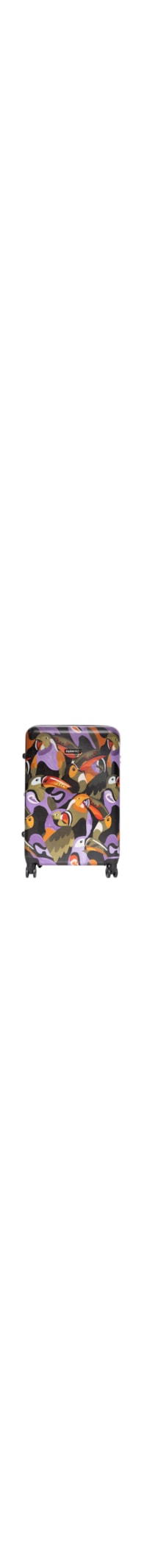 A mala roxa é produzida em material sintético. A peça possui tamanho grande, formato retangular, tamanho pequeno, compartimento interno amplo com forro, bolso amplo em tela com fechamento por zíper, faixas de gorgurão com o nome da marca e fechamento por fecho engate, alça metálica retrátil, alça de mão nas partes superior e lateral, tag da marca aplicada em borracha na parte frontal, estampa de tucanos em cores contrastantes, aplicações laterais para apoio na cor preto, cadeado embutido na parte lateral, rodas multidirecionais e fechamento por zíper.