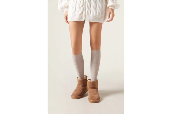 Meia alta feminina com cashmere e glitter, perfeita para adicionar elegância, glamour e conforto. Com um toque de brilho, proporciona uma sensação luxuosa e quente, ideal para os dias mais frios com estilo.