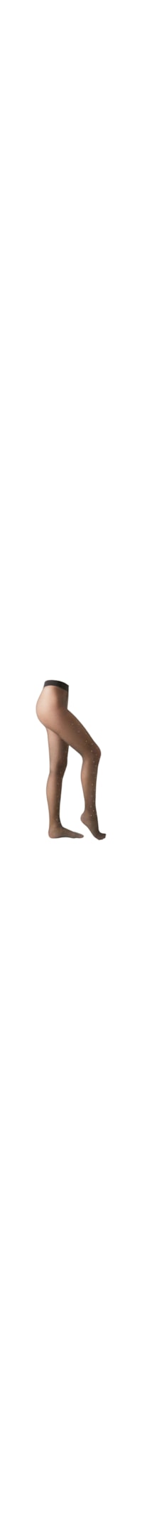 Meia-calça feminina fio 50 em rede pequena com costuras planas e entremeio de algodão invisível. Esta meia-calça com glitter é adornada com pequenas tachas na parte da frente na cor dourada.